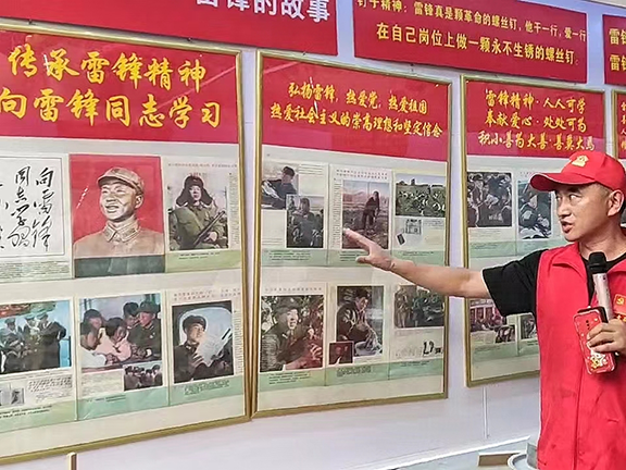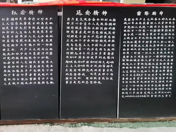 在这里,陈列着石刻艺术家们一件件雕刻着共产党人红色精神事迹的作品,李夫振代理馆长也为党史学习教育团的成员展示介绍了刚完工的石刻工程,这是刘汝彪馆长一遍遍通读党章内容,一笔一画,一丝不苟,历经两年完成的,刘馆长说,“之所以选择党章作为石刻的内容,就是想要用这种古老而庄重的形式展现出新意,突出党章的思想意义和教育意义,以启迪青年。” 就这样,刘馆长的思想吸引了一批又一批的人们走进这一名老党员的红色精神世界。