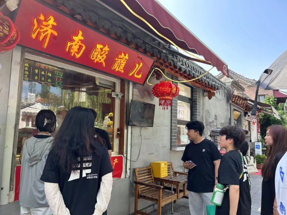6月28日,团队成员前往历下区曲水亭街开展“济南酸蘸儿”非遗文化调研活动。一边是青砖碎瓦的老屋,垂杨依依,一边是绿藻飘摇的清泉,流水潺潺,文化气息十分浓厚。“酸蘸儿”是济南传统的美食之一,具有悠久的历史和独特的地方特色。“晶红竹贯千秋过,一如悲喜品酸甜"。百花洲历史文化街区中,传统的配方和独一无二的“甩糖翅儿”工艺,造就了这一串串晶莹剔透的老济南非遗美食——酸蘸儿。同时也反映了当地人的饮食习惯、烹饪技巧和食材选择。