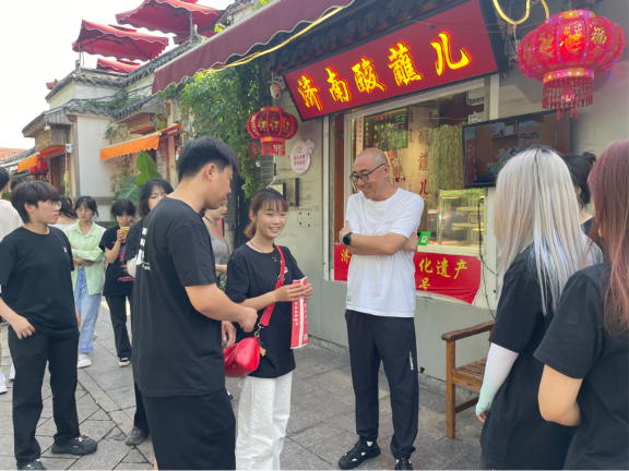 非遗传承人张正伦从酸蘸儿的文化历史背景、制作工艺、制作流程、发展现状展开讲述,让团队成员了解“济南酸蘸儿”非物质文化遗产的特点和魅力。在与非遗传承人交流和探讨的过程中发现,他不仅传承了酸蘸的制作工艺,还在创新了食材和样式,推出了迷你小盒、棉花糖等新品种,吸引了不少年轻人的目光。