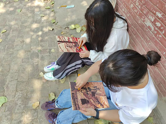 木刻版画是我国的非物质文化遗产,作为一种综合性较强的艺术形式,有着悠久的历史,并在绘画艺术中占有独特的位置。姜建勋老师就取景构图,版画起稿,刀法运用、印制技巧等专业知识给队员们进行详细讲解,并亲自演示木刻版画制作过程,同学们认真观察、仔细思考,在现场深入体验中感受传统文化的魅力。