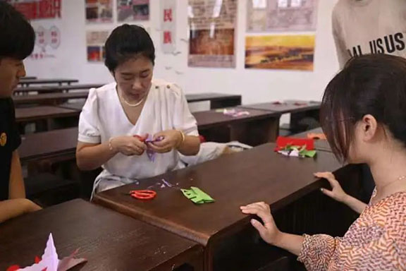 调研过程中,非遗传承人董丽娜老师充满耐心和细致地介绍了剪纸发展历程,并详细讲解了剪纸的制作方法和技巧。随后,她亲自带领大家进行实际操作示范,让每个队员都有机会亲手体验剪纸的乐趣。通过这样的互动,大家对剪纸艺术发展的现状和未来的传承有了更深入的了解。