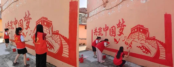在实践活动期间,“艺堂”希望小队利用自身专业优势进行了实地调研并设计完成4幅墙体彩绘,将“不忘初心、牢记使命” ,“永远跟党走”,“共筑中国梦”,“幸福都是奋斗出来的”等口号标语融入画作,不断丰富墙体文化内涵,让村民在潜移默化中接受党性教育。实践过程中“艺堂”希望小队全体成员用较短时间高效率、高质量完成了墙绘绘画活动,成为章丘区普集街道普集西村一道亮丽的风景线。此次“青年手绘青春”墙绘活动圆满完成,受到当地领导和居民的一致好评与认可。