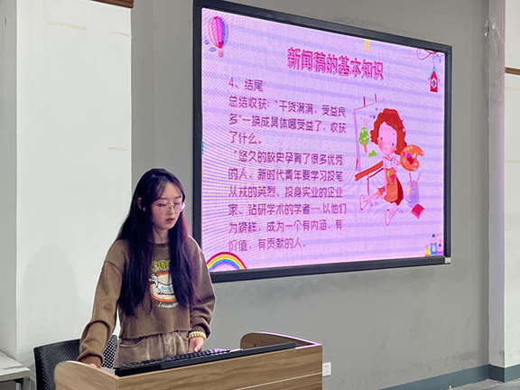 在新闻稿基本知识方面,颜玺格首先从新闻稿的核心观点引入,其次将新闻稿的题目、结构安排、新闻六要素、活动内容、结尾等各方面逐一展开叙述。通过这个环节,学生干部对新闻写作有了较为系统的认识,对新闻稿写作的理解更加深刻,进一步提高了团总支成员的新闻稿撰写能力,保障各项宣传工作更加积极有效地开展。