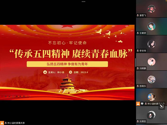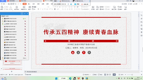 为深入学习贯彻习近平新时代中国特色社会主义思想主题教育,推动理论学习入脑入心,引领时代新风,发扬青年楷模优秀品质,弘扬“爱国、进步、民主、科学”的五四精神,4月26日,工业设计学院团总支开展“传承五四精神 赓续红色血脉”主题团日活动。