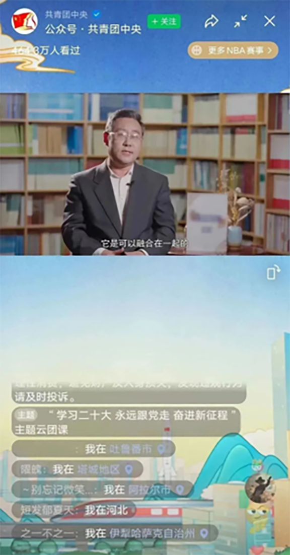 本次云团课将通过学者讲述、沉浸场景、互动交流等形式,从“非凡十年谱华章、思想之旗领航向、人间正道开新篇、初心砥砺天地间、团结奋斗正当时”五个篇章和特别篇“盛会归来话青年”共六个部分对党的二十大精神的重要意义和丰富内涵进行了全方位学习解读。