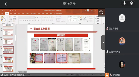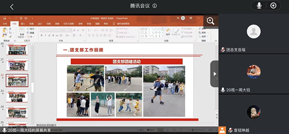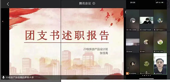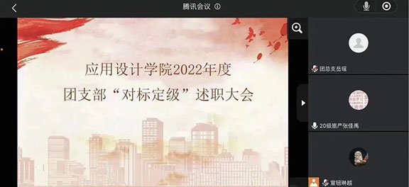 为推动基层团组织规范化建设,增强团支部的组织力,彰显政治功能和社会功能,应用设计学院团总支于12月5日开展线上团支书述职大会,本次会议由团总支委员宣钮琳越主持,团总支副书记、辅导员、团总支委员及各班团支部书记参加。