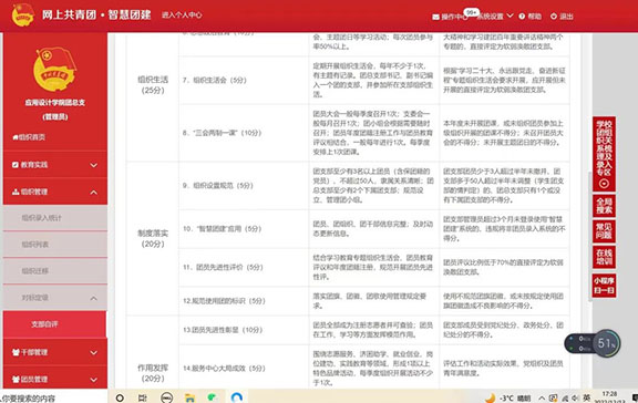 会前,各团支部结合专题组织生活会,对照参考标准,采取“五必评、双签字”方式确认自评结果,并由团支部书记在智慧团建中完成自评定级结果录入。