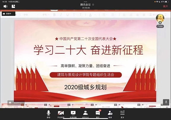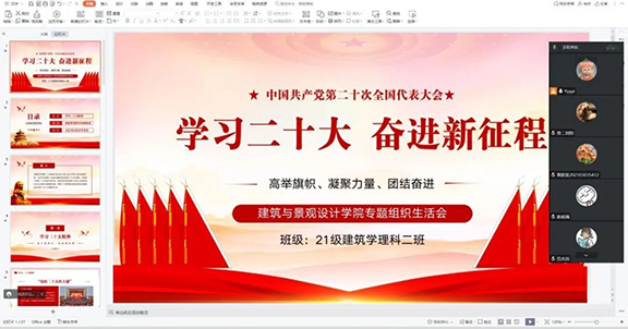 为深入学习宣传贯彻党的二十大精神,用党的科学理论武装青年,用党的初心使命感召青年,建筑与景观设计学院团总支于11月30日线上开展“学习二十大、永远跟党走、奋进新征程”专题组织生活会,会议由各班团支书主持,全体团员参加。