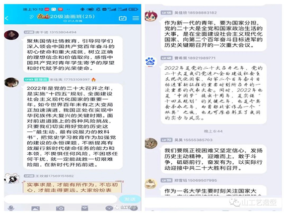 各团支部也围绕这两个中心点以线上线下相结合的方式开展学习讨论。同时,结合学校实际情况,针对校园疫情防控、安全稳定、心理健康等重点问题进行了重要文件、重要精神学习与解读,号召大家充分发挥团员青年的示范引领作用,牢记党的宗旨、继承党的优良传统,严守疫情防控要求,筑牢校园安全防线,献礼党的二十大。团课结束后,团员们纷纷表示,身为新时代青年,我们要担负起青春的使命,明确自身的奋斗方向,提高自身能力,为祖国繁荣建设做贡献,为实现中华民族伟大复兴的中国梦不懈奋斗,在花样年华中绽放青春风采,让青春在党和人民最需要的地方绽放绚丽之花。造型艺术学院团总支27个团支部学习覆盖率100%,各团支部青年大学习完成率始终保持100%。