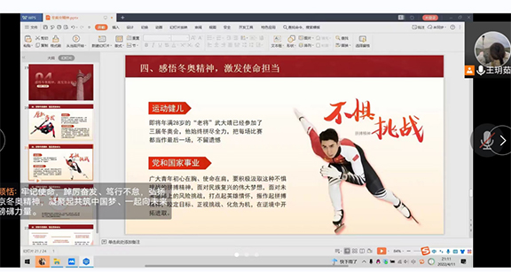 团总支委员侯新蕊以《弘扬冬奥精神——做新时代拼搏奋斗者》为题,带领同学们重温冬奥精彩瞬间,感受中国奥运健儿们拼搏、坚持、挑战、进取的奥运精神,希望同学们要从冬奥精神中汲取奋进力量,拼搏竞进、自强不息,勇毅前行,争做新时代的拼搏者、奋斗者,为中华民族伟大复兴贡献自己的青春力量。