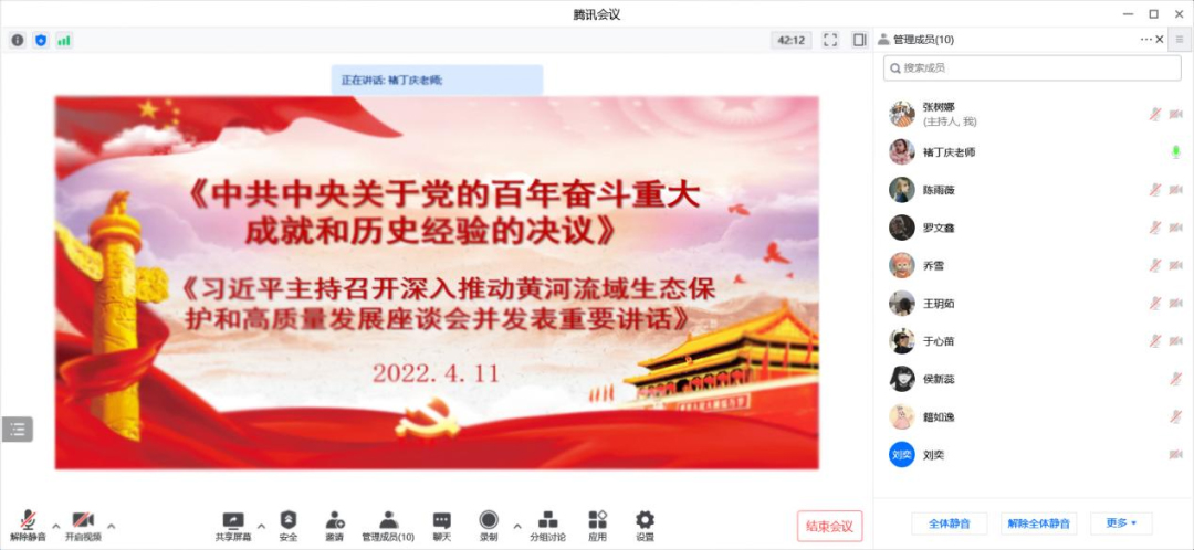 褚丁庆老师带领团员干部认真学习《中共中央关于党的百年奋斗重大成就和历史经验的决议》及《习近平主持召开深入推动黄河流域生态保护和高质量发展座谈会并发表重要讲话》,引导青年学生深刻认识党百年奋斗的初心使命和重大成就,深刻感悟党对青年学生寄予的厚望和时代赋予的光荣使命。