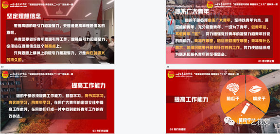 视觉团总支副书记陈瑶面向全院团干部主讲线上团课。团课中,陈老师带领大家一起学习了习近平总书记关于青年工作的重要思想,指出推动共青团事业不断开创新局面,团干部要做到“四个必须”——必须坚定理想信念、必须心系广大青年、必须提高工作能力、必须锤炼优良作风。希望视觉团干部队伍能增强使命感、责任感和凝聚力,带领广大青年努力成为可堪大用、能担重任的栋梁之才。