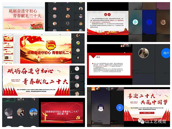 2022 年是党的二十大召开之年,是中国共产主义青年团建团 100 周年。为深入学习贯彻党的十九大和十九届历次全会精神,贯彻落实习近平总书记关于青年工作的重要思想,持续巩固深化拓展党史学习教育成果,教育引导广大团员青年坚定不移听党话、跟党走,庆祝建团 100 周年,以奋发向上的精神状态迎接党的二十大胜利召开。3月21日至4月10日间,视觉传达设计学院团总支、各团支部以线上形式开展“砥砺奋进守初心 青春献礼二十大”团队第一课。