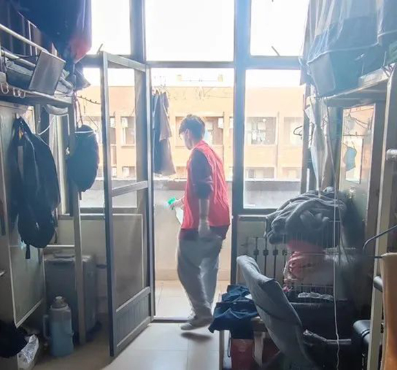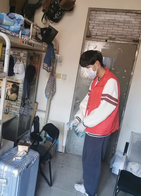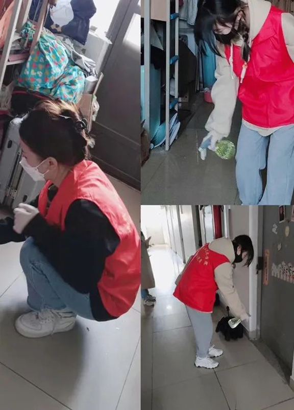 下午1:00,志愿者们戴好口罩、医用手套,全副武装,对学生宿舍地面、卫生间、门口等主要区域进行逐层、逐片、逐点消杀,做到不留死角、不留盲区,全面清除卫生死角,实现多维度全方面的立体消杀。