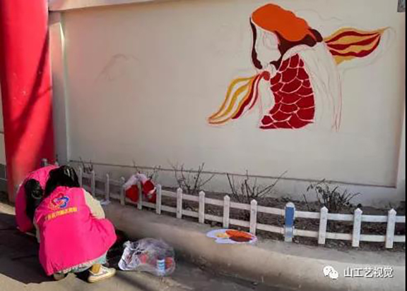 工作中,我们搜集相关墙体彩绘的资料,挖掘素材对乡村文化氛围营造的积极作用。通过与当地政府相关工作人员商讨,确定了墙绘内容——在两个墙体上绘制同种风格的锦鲤,寓意年年有余,也是我们为村民带来的新年礼物。在绘制过程中,服务队工作人员与我们一同构思造型,大胆的尝试不同的呈现形式,同时也帮我们进行部分绘制。几天的相处,团队成员之间的感情更深了。此次墙绘实践也提高了自己对墙体绘画的了解和认识,还在实践中充分地提高了自己的能力,接触了社会,使自己在各方面获得了全方位的提高。