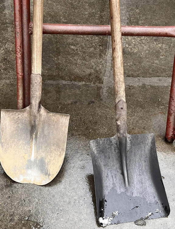 铲,在我的家乡莱州又叫铁锨。在机械未取代手作的时候,铲大多数用作耕地、铲菜等用途。几乎在农村家家户户都人手一个,甚至多到家里有五六个。铲又分为很多种,但最常见的是圆头铲和平头铲。相对于其他工具,平铲在使用中最为顺手。在制作中,铁匠通常会将铲的上半部分做的比较宽,在木柄与铁器的交界处,通常有个空,且在铁的最上端做成圆形,使耕地翻地时便于农民发力。