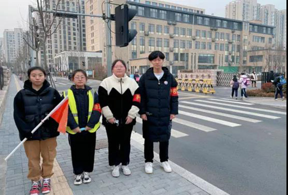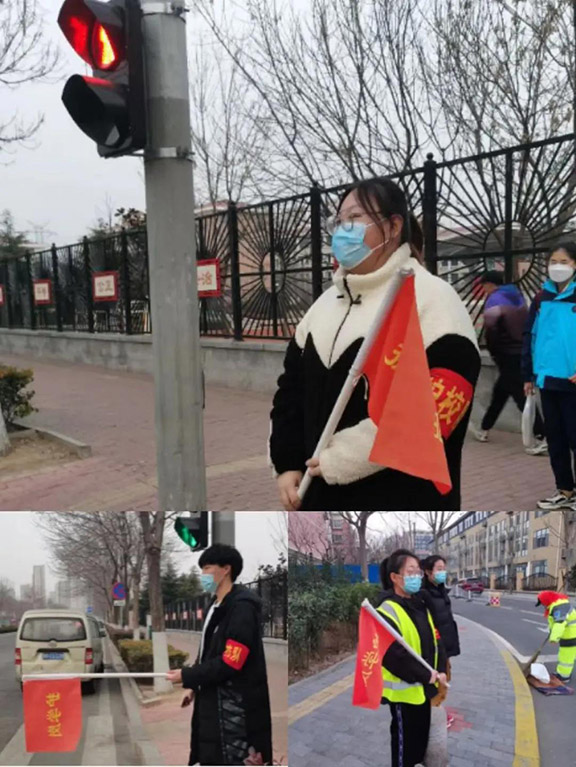 “飞鸟”实践队成员走进中小学开展护学助学志愿服务活动。团队成员李尚宇、李艺铭、郝景怡、桂维迪四名学生深入青岛市市北中学参与疫情防控,分别在学校门口、图书馆、医务室等地开展秩序引导、体温测量、酒精消毒等工作;成员李冰同学于家乡临沂市临沭县实验小学开展体温测量、文明交通劝导志愿活动,有力保障了学生安全、有序、文明入学。身穿马甲,手举红旗的青年志愿者们忙碌的身影构筑起最靓丽的风景线。那一抹“志愿红”既让广大学子在上学路上有了暖心的陪伴,也成为家长们最安心的依托。