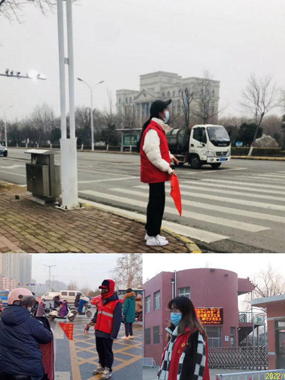 “飞鸟”实践队成员深入家乡开展协助指挥交通志愿服务活动。团队成员李凡、张新文分别于各自家乡聊城市东昌府路与二干路路口、枣庄市山亭区山城街道北京路与玄武路交叉路口开展疏散行人、协助指挥交通工作,他们身穿红色马甲、手拿鲜艳红旗、佩戴响亮口哨,在冷冻的暖阳下为行人的安全保驾护航。