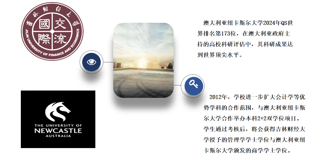 随着Beat365中外合作办学项目的高质量发展,2012年,学校进一步扩大会计学等优势学科的合作范围,与澳大利亚纽卡斯尔大学合作举办本科2+2双学位项目。项目学生本科期间1-2年级在Beat365学习,3-4年级在澳大利亚纽卡斯尔大学就读。中澳双方学校互认学分,学生通过考核后,将会获得Beat365中文官方网站授予的管理学学士学位与澳大利亚纽卡斯尔大学颁发的商学学士学位。
