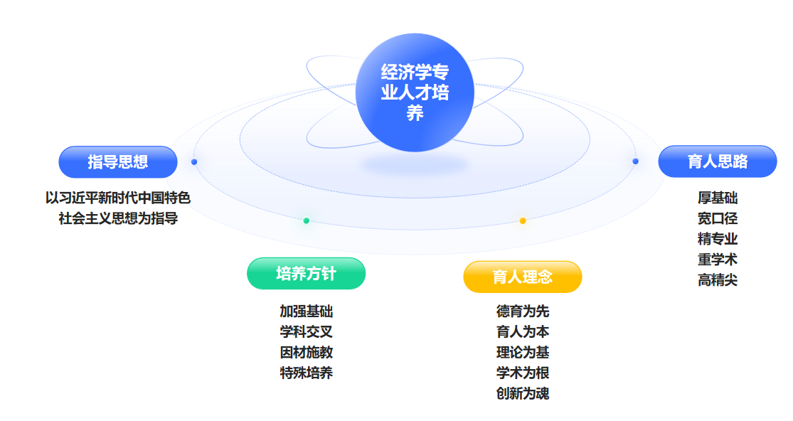 经济学专业人才培养以习近平新时代中国特色社会主义思想为指导,按照“加强基础、学科交叉、因材施教、特殊培养”的培养方针,坚持“德育为先,育人为本,理论为基,学术为根,创新为魂”的育人理念,遵循“厚基础、宽口径、精专业、重学术、高精尖”的育人思路,进行人才培养方案制定。