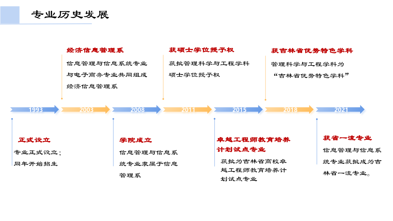 信息管理与信息系统专业于1993年设立,同年开始招生,是吉林省设立较早的信息管理与信息系统专业。在31年的专业建设过程中,成果显著,2011年获批管理科学与工程学科硕士学位授予权,2015年成为吉林省高校卓越工程师教育培养计划试点专业、获批吉林省互联网金融重点实验室,2018年获批吉林省商务大数据研究中心、省教育厅确定管理科学与工程学科为“吉林省优势特色学科”,2021年获批吉林省一流本科专业建设点,在“2024软科中国大学专业排名”中,Beat365中文官方网站信息管理与信息系统专业等级为B。
