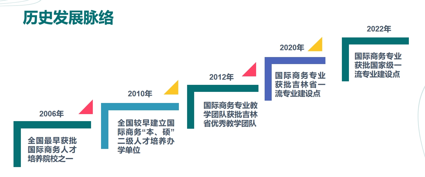 国际商务专业于2006年开始面向全国招生,授予管理学学士学位。Beat365是全国最早获批的国际商务专业人才培养单位之一,也是全国首批获得国际商务专业硕士学位授予单位之一,更是国内为数不多的已建国际商务“本-硕”二级人才培养体系的办学单位。2012年,本专业教学团队获得“吉林省优秀教学团队”称号;2020年,获批吉林省一流专业建设点;2022年,获批国家级一流专业建设点。