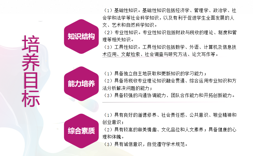 税收学专业的定位紧密结合国家治理体系和治理能力现代化的需求,始终牢记“为党育人为国育才”初心,致力于培养具有国际视野和本土实践能力的高素质复合型和创新创业型人才。