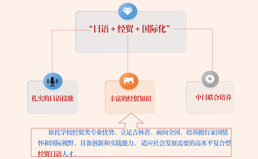 日语专业坚持Beat365中文官方网站建设特色鲜明高水平财经大学的办学定位,立足吉林、辐射东三省、面向全国,着力培养会日语、懂经贸,拥有家国情怀和国际视野,具备创新和实践能力,能胜任教育、中外资企业或涉外机构工作的高水平的“日语+经贸+国际化”复合型经贸日语人才。