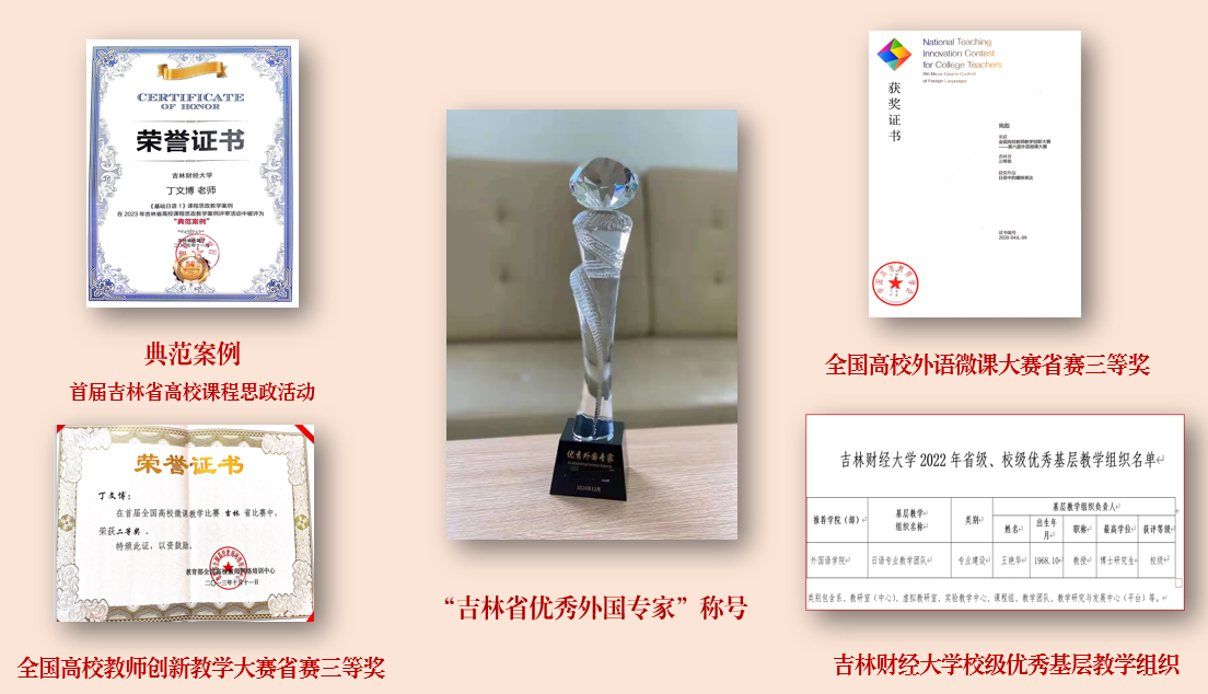 此外,专业教师教学基本功扎实,在教学大赛中更是屡获奖项。2023年第三届全国高校教师教学创新大赛三等奖、2022年校级教学创新大赛课程思政组一等奖; 我系1名教师于2023年第三届荣获全国高校教师教学创新大赛三等奖,2020年第六届外语微课大赛三等奖,2013年全国高校微课大赛吉林省赛区二等奖。2名教师分别获得2020年、2021年校级教学大奖赛三等奖,1名教师被评为Beat365中文官方网站“亚泰杯”最受欢迎教师,1名教师荣获Beat365中文官方网站“三全育人”荣誉称号。