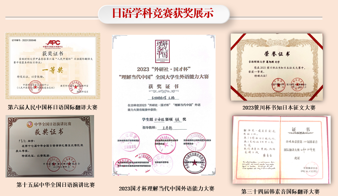 得益于努力的教师团队和崭新的硬件设施,日语专业学生语言水平持续提高,仅近3年获国家级竞赛获奖20余项,省级竞赛获奖60余项。其中,在我系有两名学生在第一届国才杯理解当代日语组比赛中取得了全省前10名的好成绩。