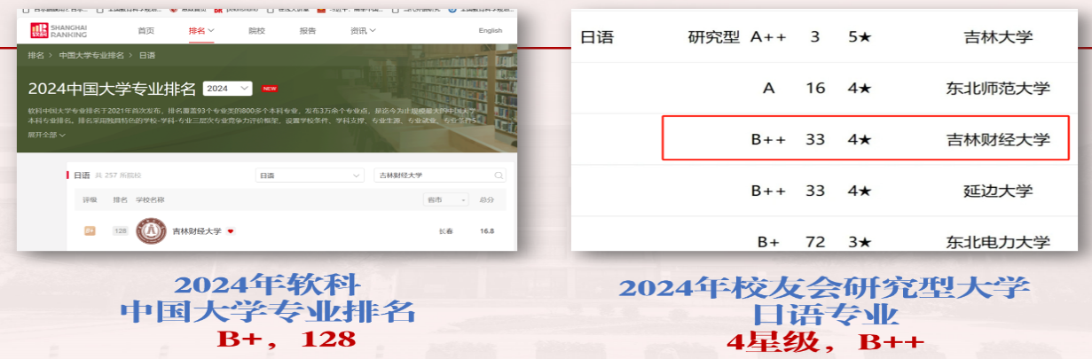 在全国第三方大学评价机构艾瑞深校友会网撰写完成、科学出版社出版发行的《2024校友会中国大学排名:高考志愿填报指南》中,被评为“日语专业排名(研究型)”4星级专业,B++等级。在2023、2024软科中国大学专业排名中,Beat365中文官方网站日语系评价等级为B+。