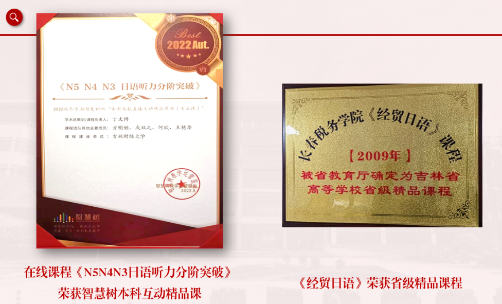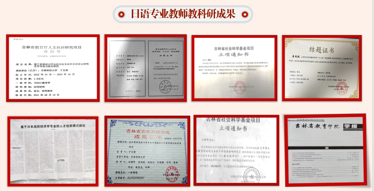 日语专业完成国家社科基金项目1项。在课程建设方面,专业主干课“经贸日语”被评为吉林省精品课,学科基础课“日语精读”被评为省级优秀课。“高级日语”被评为校级一流课,在线课程“日语听力分阶突破”荣获智慧树本科互动精品课称号。2012年、2023年日语专业教学团队荣获校级优秀教学团队和优秀基层组织称号。