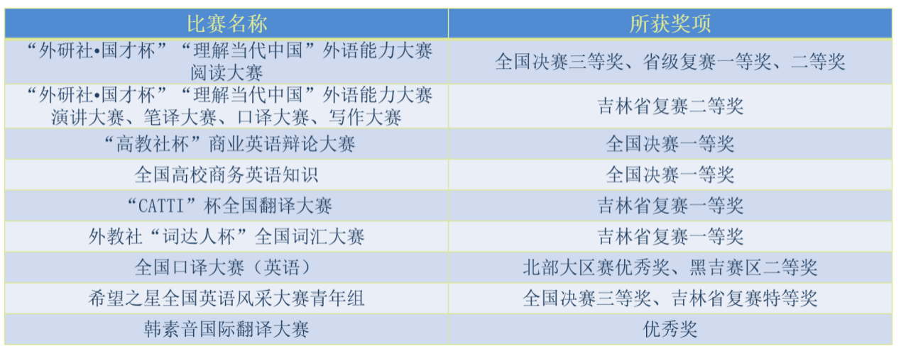 “第二课堂”即课外实践,包括丰富多彩的第二课堂活动、创业创新大赛、各类英语专业水平及技能大赛等。近年来,本专业组织学生参加高水平的学科竞赛,已经形成了以赛促学、以赛促教,教、学、测、赛一体化的教育教学模式。2018年以来,本专业学生在英语学科竞赛中,国家级比赛获奖21项,省级比赛获奖60余项,所有专任教师都曾获得优秀指导教师奖。以下为学生所获部分奖项: