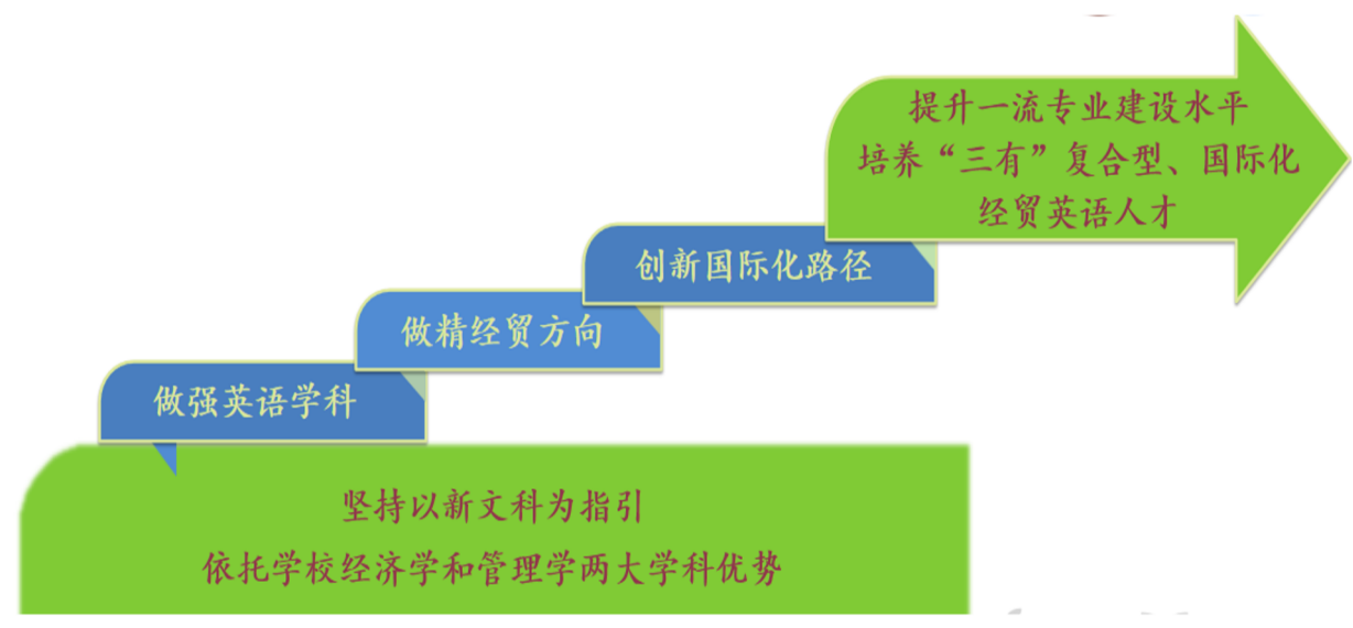 随着全球化的发展和我国在国际舞台的地位越来越重要,我们国家需要更多既精通外语又精通经贸知识,并且具有国际化视野和家国情怀的复合型人才。因此,本专业坚持以新文科建设为指引,依托学校经济学和管理学两大学科优势,构建了培养复合型、国际化的“外语+经贸”人才的培养模式。本专业在做强英语学科的同时,深化经济学、管理学等学科的交汇融通,做精经贸方向;在不断创新国际化路径,开拓学生国际化视野的同时,强化全过程育人、全方位育人,培养具有家国情怀,能够讲好中国故事、树立好中国形象的新型外语人才。