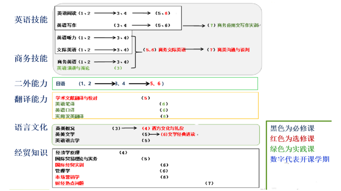 (三)知识目标:学生具备扎实的英语语言知识,掌握英语语言学、英美文学、欧美社会文化等专业知识,具备广泛实用的经贸和商务专业知识,形成扎实的英语语言基本功和经贸方向专业理论基础。