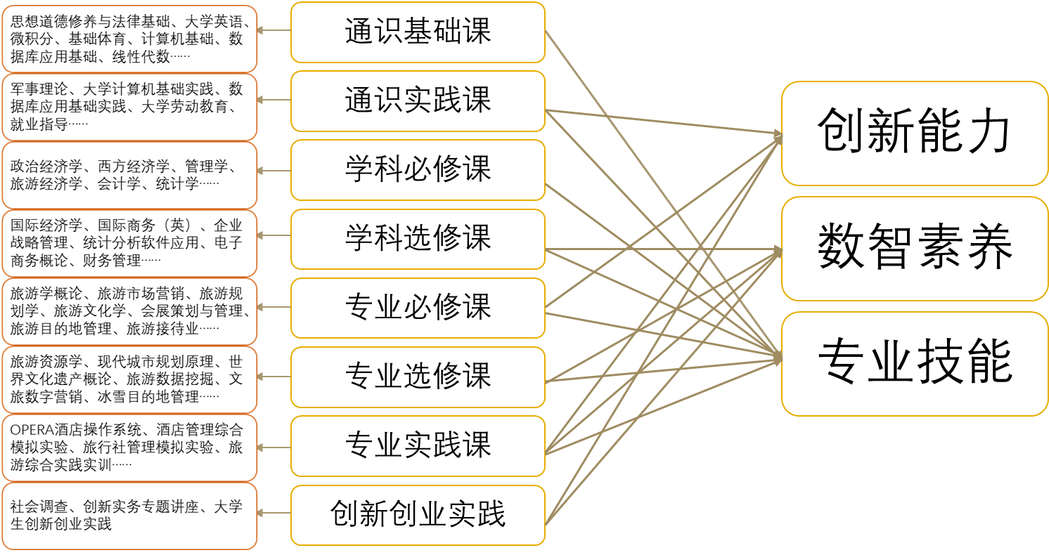 构建“专业技能+数智素养+创新能力”的多元人才培养模式,要以相应的课程体系作为支撑。目前,旅游管理专业的课程体系主要包括4类课程8个模块,其中通识类课程包括2个模块,学科类课程包括2个模块,专业类课程包括3个模块,创新创业实践类课程包括1个模块。如图1所示,我们希望能够通过学科类课程和专业类课程培养学生的专业技能,通过学科选修课和专业实践课夯筑学生的数智素养,通过通识实践课、专业实践课和创新创业实践课提升学生的创新能力。