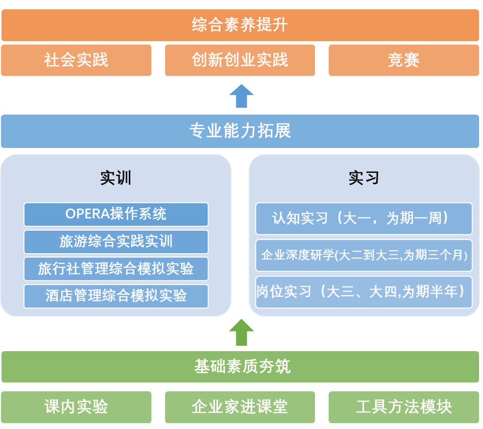在扎实奠定旅游知识基础,深刻理解旅游管理类专业的理论、方法以及实践发展前沿的基础上,通过课程、竞赛、讲座、实践等途径,培养学生使用量化研究方法与软件工具的能力,能够运用信息化思维、大数据思维等创造性地解决问题,鼓励学生投身创新创业实践,培养创新意识和能力,促进思维和能力的全面发展。