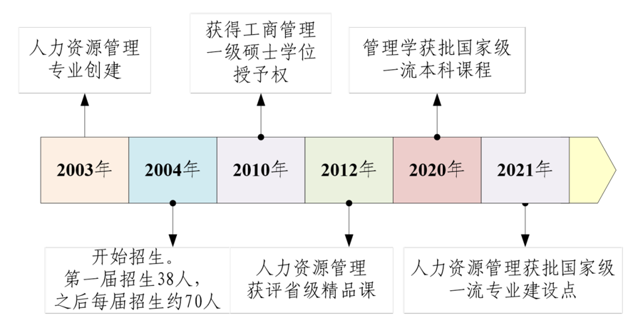 人力资源管理专业创建于2003年,2004年开始招生,2010年获得工商管理一级硕士学位授予权,2012年人力资源管理课程获得省级精品课,2020年管理学获批国家级一流本科课程,2021年人力资源管理专业获批国家级一流专业建设点,2023年人力资源管理课程获评省一流课程并被推荐申报国家一流本科课程,专业发展史详见图1所示。