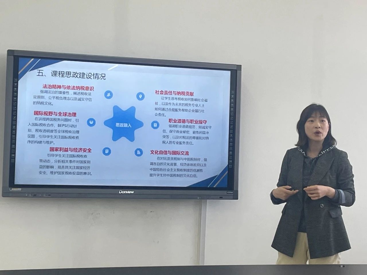 首先,由财政系李美琦老师、税收制度系邢树东教授、国际税收系安然老师以及税务管理系曹阳副教授分别对《财政学》、《税收经济学》、《英美税制》以及《税务管理》等四门专业必修课程,围绕课程目标、课程建设、课程内容、课程思政、教材选取及授课方法等内容进行说课展示。接下来,学院教师结合四位老师的说课内容展开热烈的讨论,不仅对本次参与展示的课程提出了建设性建议,也覆盖了课程体系的优化、教师专业能力提升等方面内容。最后,张巍院长对四位专业教师的精彩说课表示赞赏,邢教授充分展示了深厚的教学功底,三位青年教师的成长进步也让她对税务学院专业课程教学能力的提升充满信心。陈德民书记进一步结合师德师风建设,期许税务学院打造一支政治素质过硬、业务能力精湛和育人水平高超的优秀教师队伍。