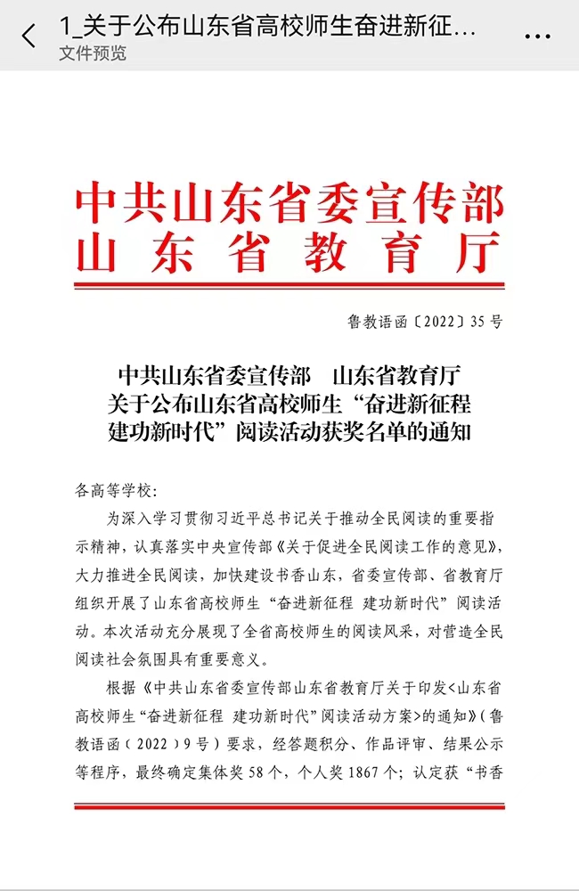 近日,由山东省委宣传部指导,山东省教育厅主办的“山东省高校师生’奋进新征程 建功新时代’阅读活动”圆满落幕。永利官网师生在“书香山东·读书征文”“书香山东·经典朗读”“书香山东·掌上读书”等各个子活动中表现突出,获得了优异成绩。共获一等奖3项,二...