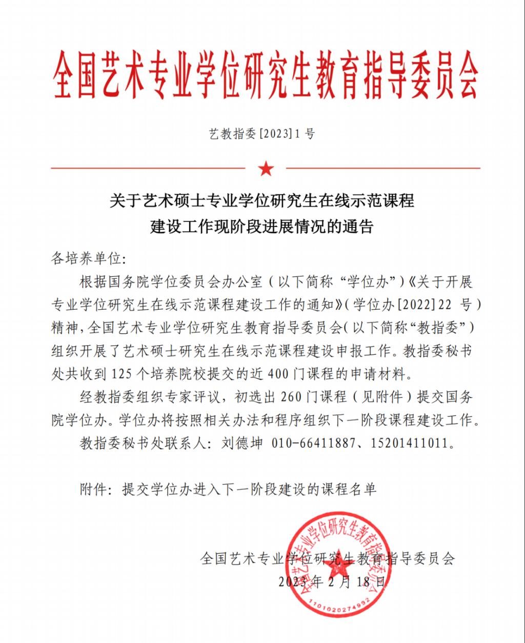 近日,全国艺术专业学位研究生教育指导委员会下发《关于艺术硕士专业学位研究生在线示范课程建设工作现阶段进展情况的通告》(艺教指委[2023]1 号),永利官网推荐的六门研究生课程全部入选全国艺术硕士专业学位研究生在线示范课程。为加强艺术专业学位研究生...
