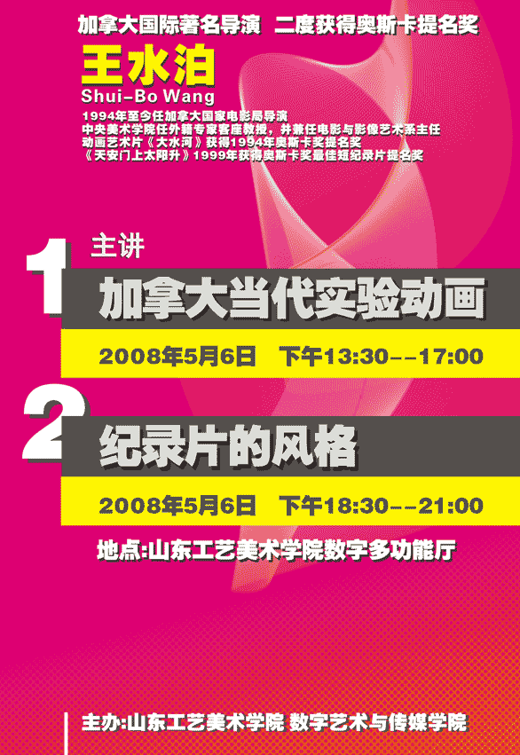加拿大著名华人导演王水泊将来永利官网进行学术交流 应永利官网数字艺术与传媒学院的邀请,加拿大著名华人电影导演王水泊,将于2008年5月6日至7日在永利官网举行为期两天的学术交流与研讨。